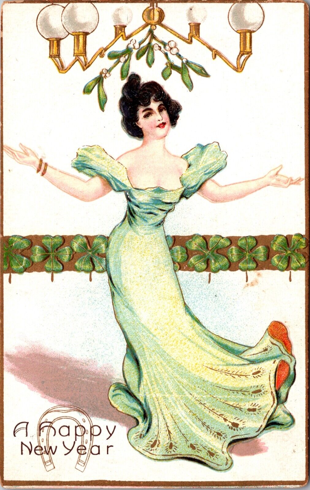 A Happy New Year Postcard Woman Dancing Under Mistletoe Four Leaf Clovers