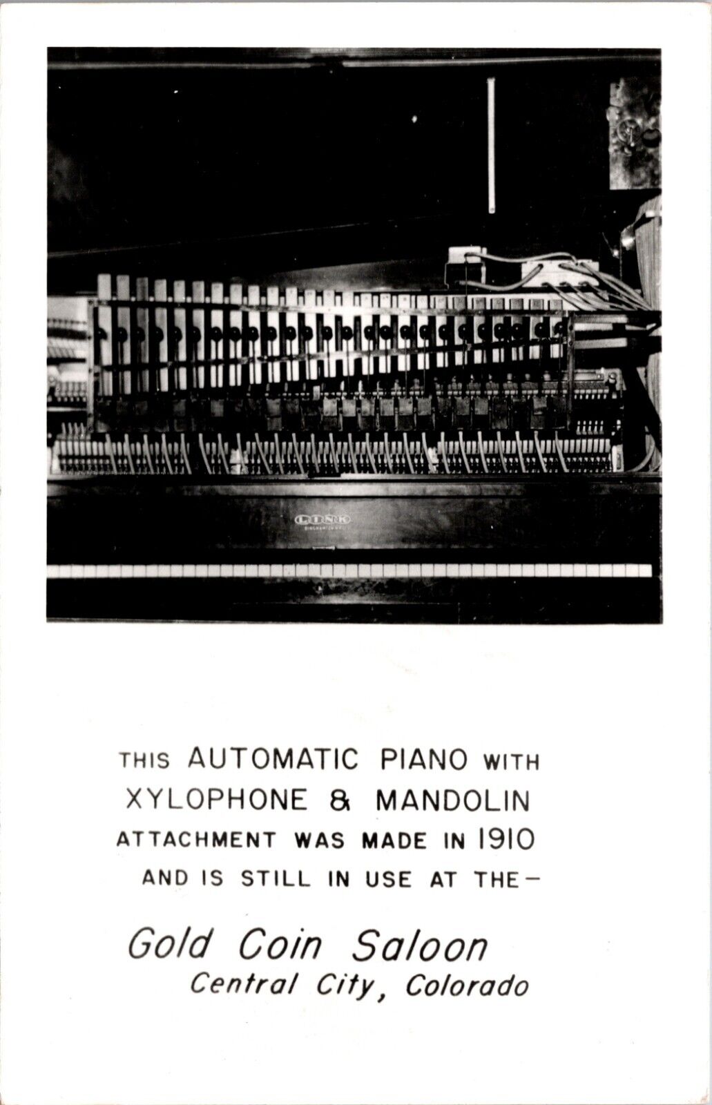 Immerse yourself in the historical charm of Colorado with this authentic Real Photo postcard featuring an elegant Automatic Piano, Xylophone, and Mandolin from the Gold Coin Saloon in Central City. A glimpse into the past, this unposted card captures the essence of musical entertainment and the vibrant culture of early 20th-century American cities and towns.