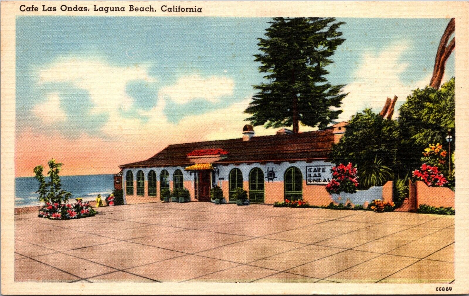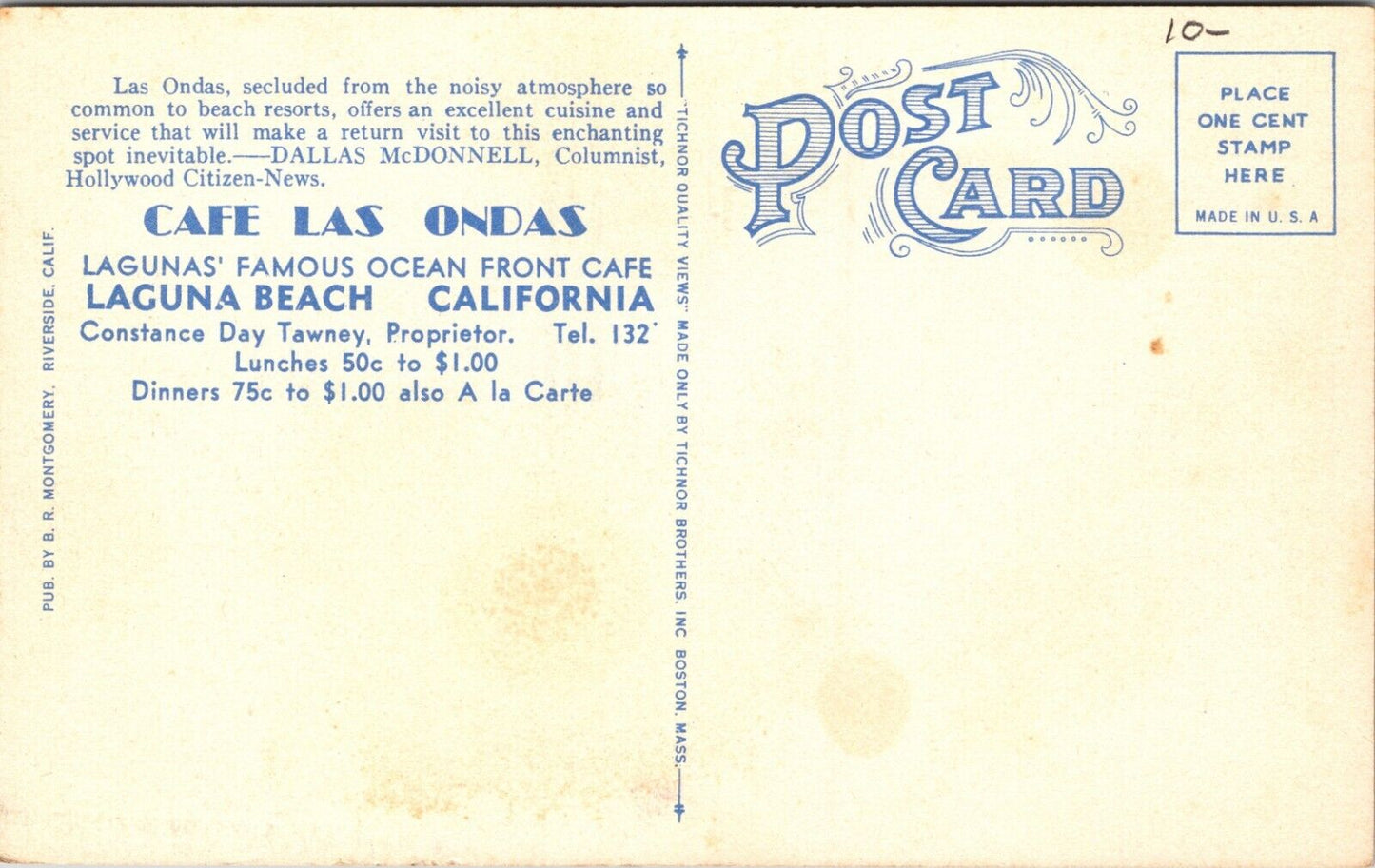 The Cafe Las Ondas Lagunas Famous Ocean Front Cafe in Laguna Beach, California is a vintage linen postcard featuring a standard size of 5.5 x 3.5 inches. Published by Tichnor Brothers, this original photo of the restaurant and diner captures the essence of the landmark cafe on the ocean front. With a divided back and in unposted condition, this postcard offers a glimpse into the history and charm of this famous place in North America's California region. Perfect for collectors interested in architecture, famous places, hotel and restaurant advertising, and city and town themes.