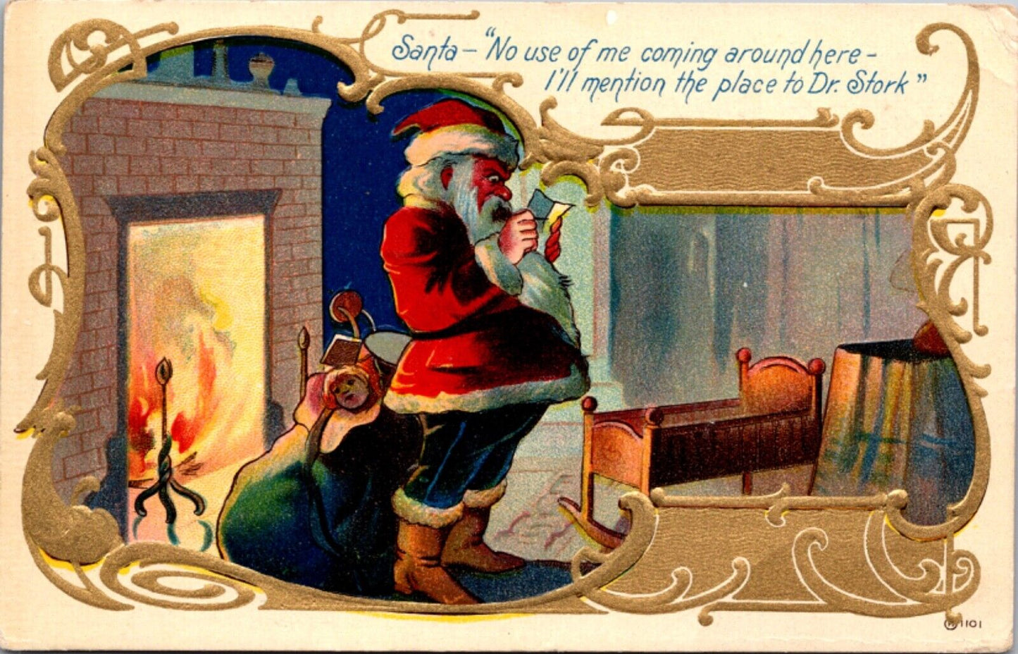 Christmas PC Santa Claus Inside House Reading List Sack Bag of Toys Fireplace