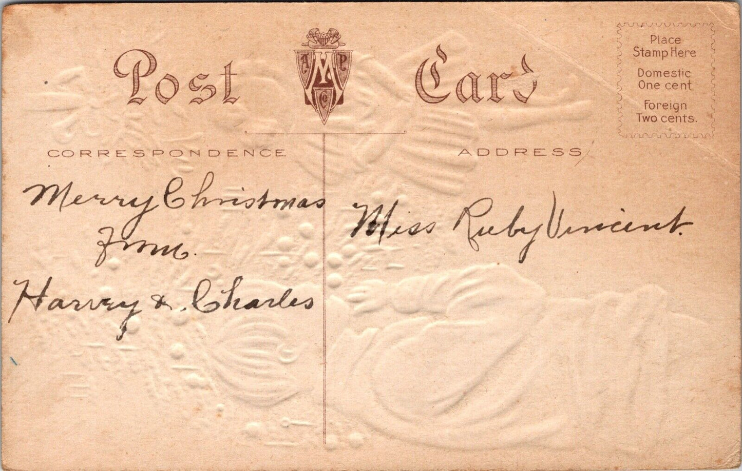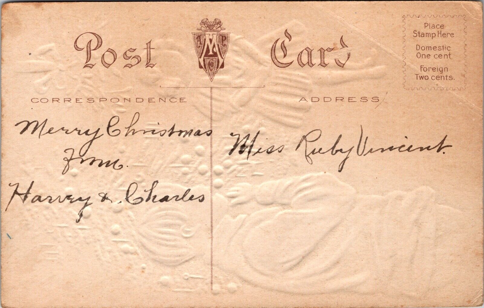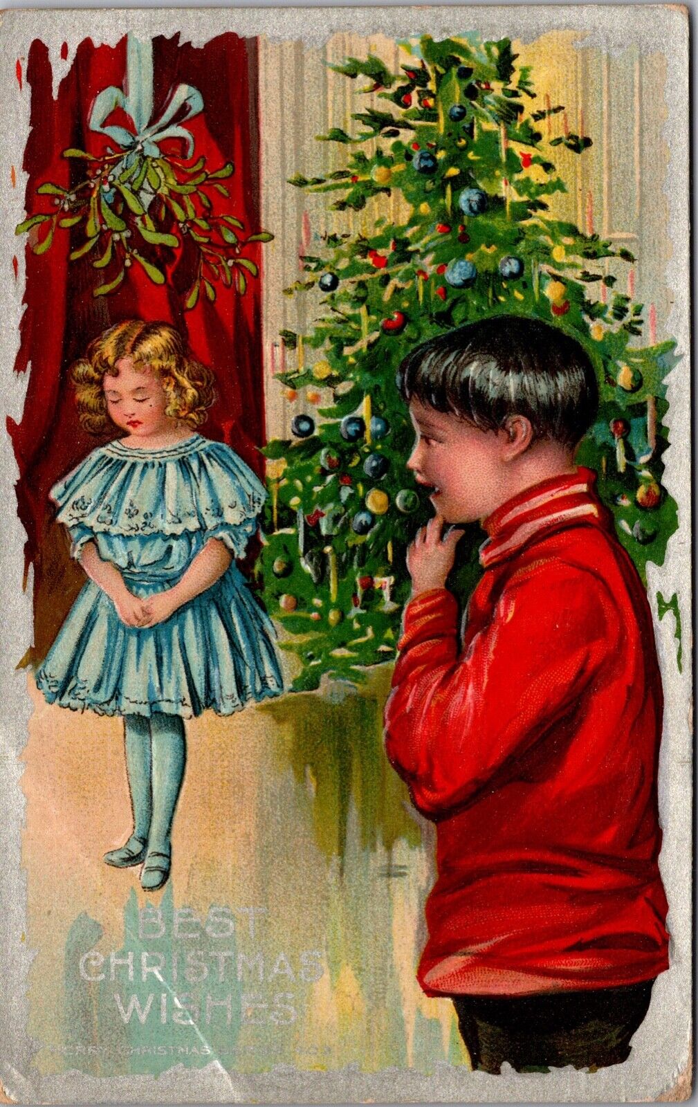 Christmas Postcard Boy Looking at Girl Standing Under Mistletoe