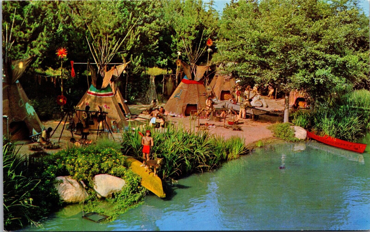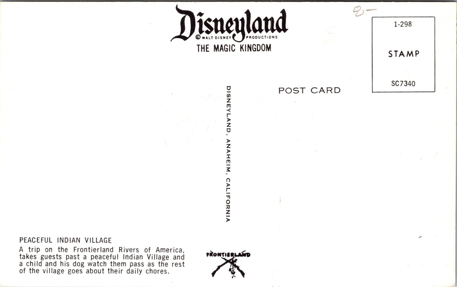 Step into the vibrant heart of American fantasy and adventure with this charming postcard from Disneyland's Peaceful Indian Village. A product of Walt Disney Productions, this standard-sized lithograph captures the essence of the iconic Jungle Cruise on the Rivers of America. Crafted with a glossy chrome finish, it brings the nostalgia of Anaheim's famed amusement park right to your fingertips.