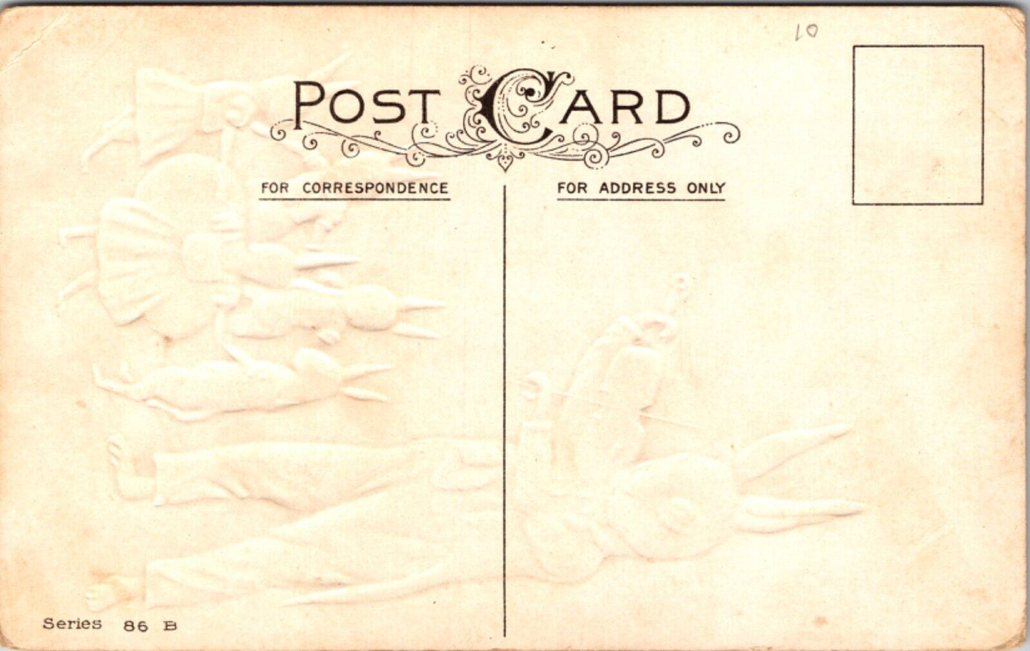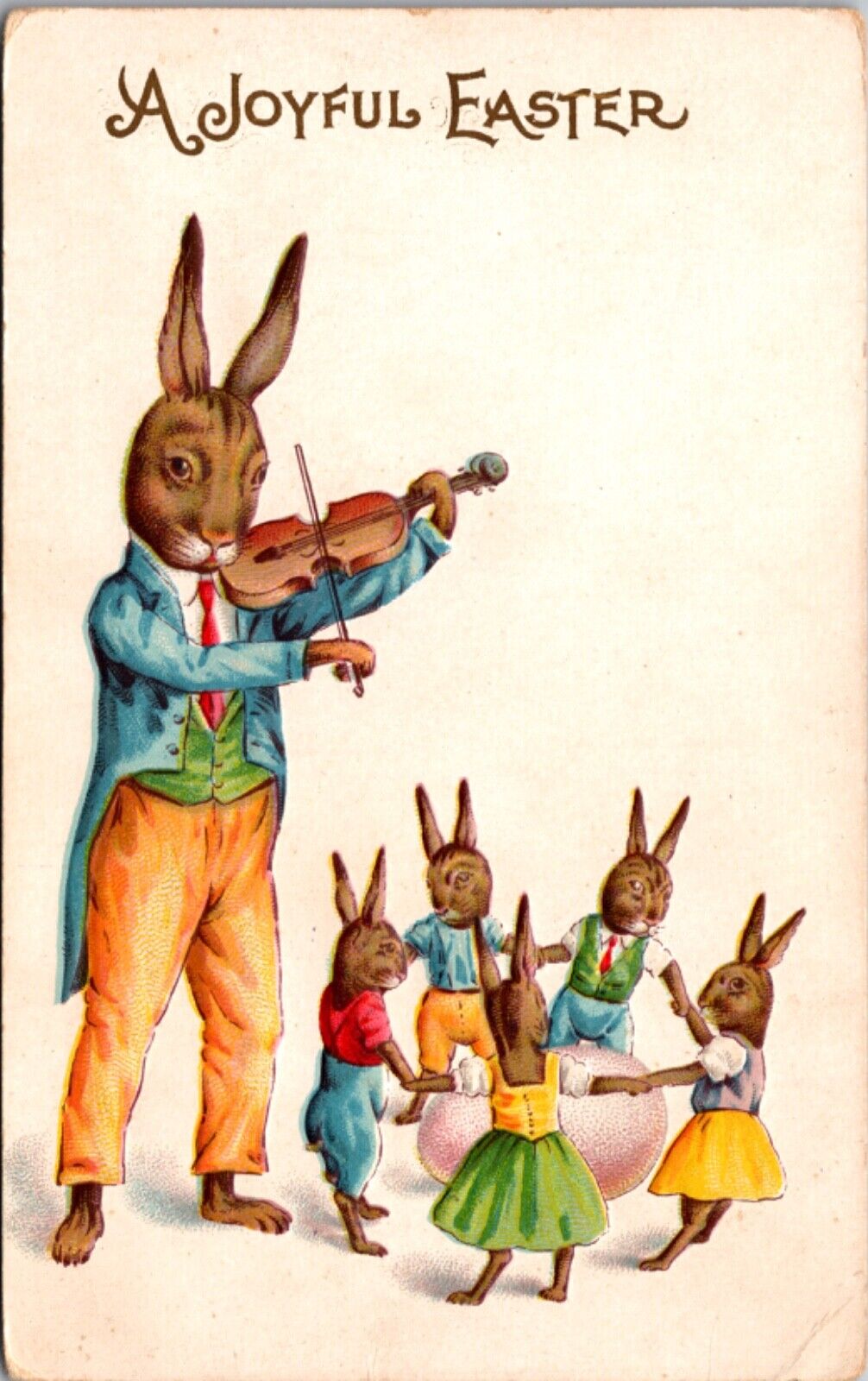 Easter Postcard Dressed Father Rabbit Playing Violin to Baby Bunny Dancing