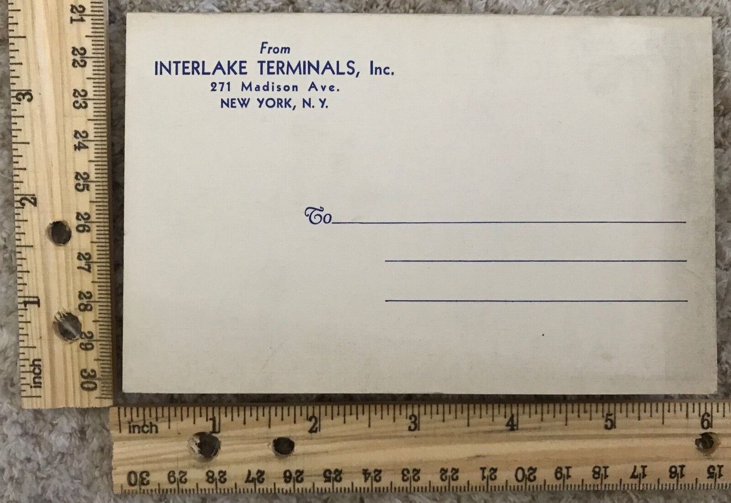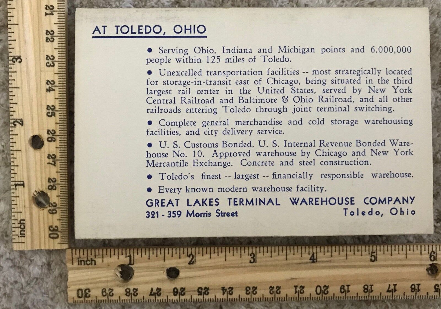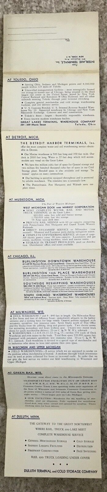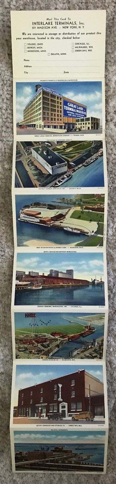 A vintage advertising fold-out linen postcard for Interlake Terminals; Great Lakes Terminal Warehouse Company in Toledo, Ohio; Detroit Harbor Terminals in Detroit, Michigan; West Michigan Dock and Market Corp in Muskegon, Michigan; Crooks Terminal Warehouses Inc. in Chicago, Illinois; Hansen Storage Company in Milwaukee, Wisconsin; Leicht Transfer and Storage Company in Green Bay, Wisconsin; Duluth Terminal and Cold Storage Company in Duluth, Minnesota