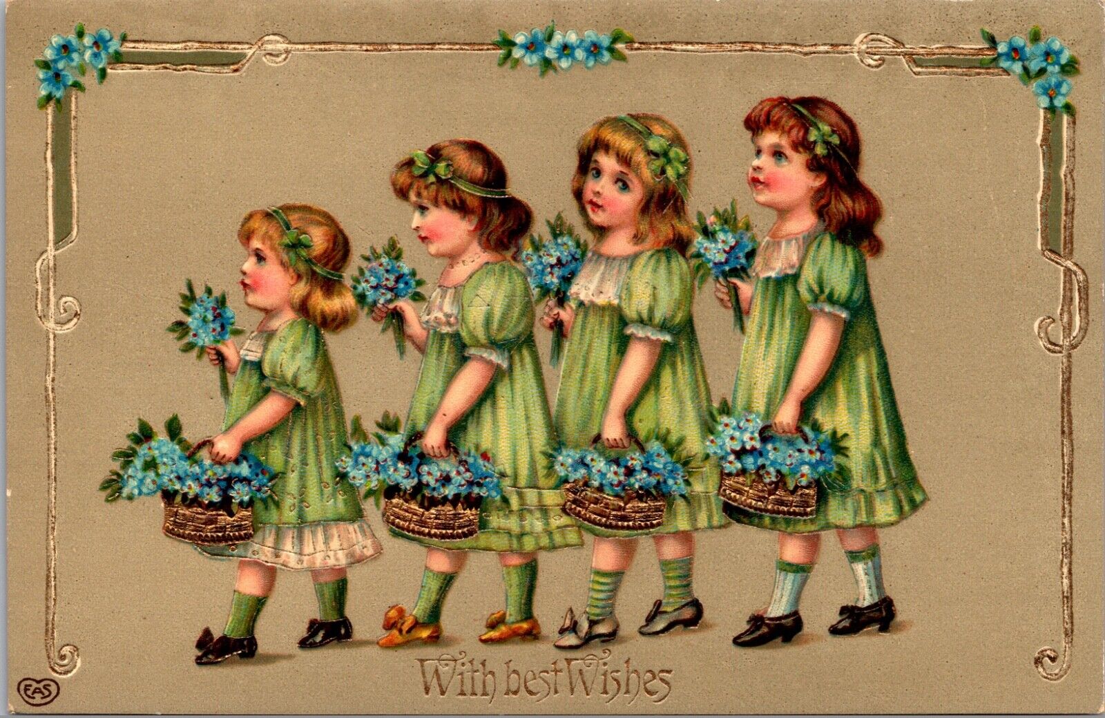 GEL Best Wishes PC Four Young Girls Carrying Forget Me Not Flowers in Baskets
