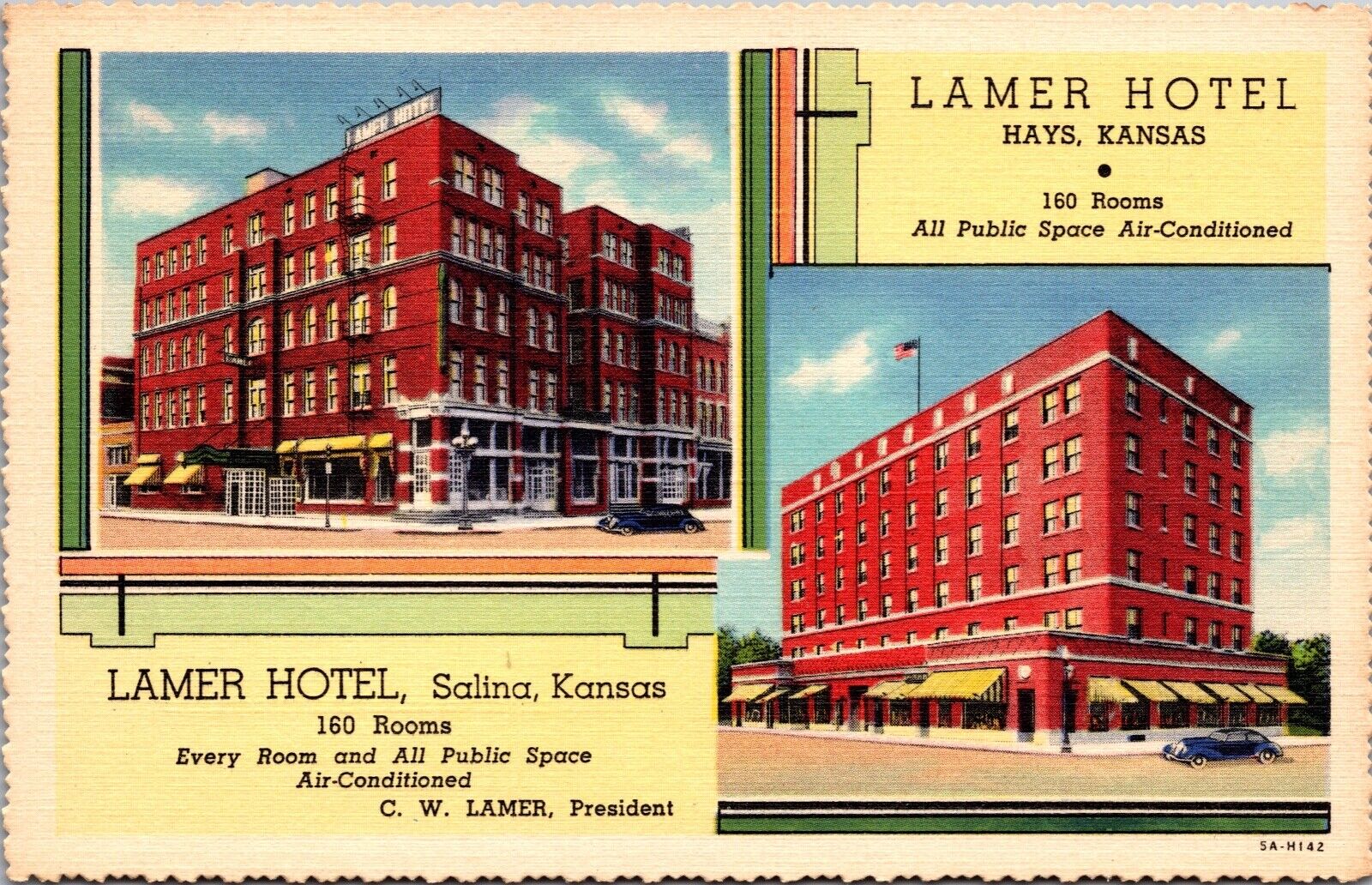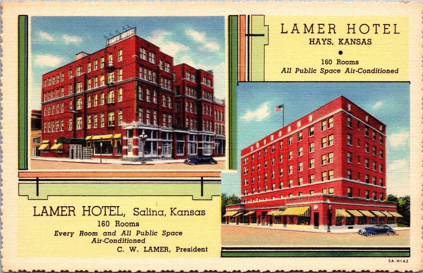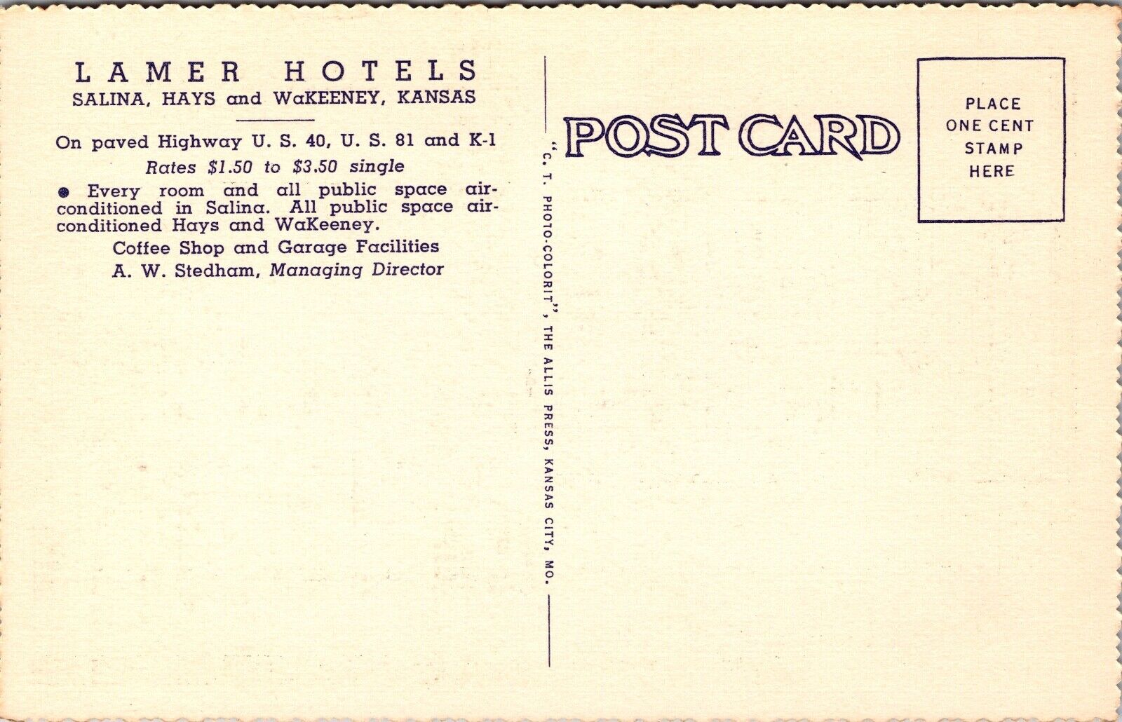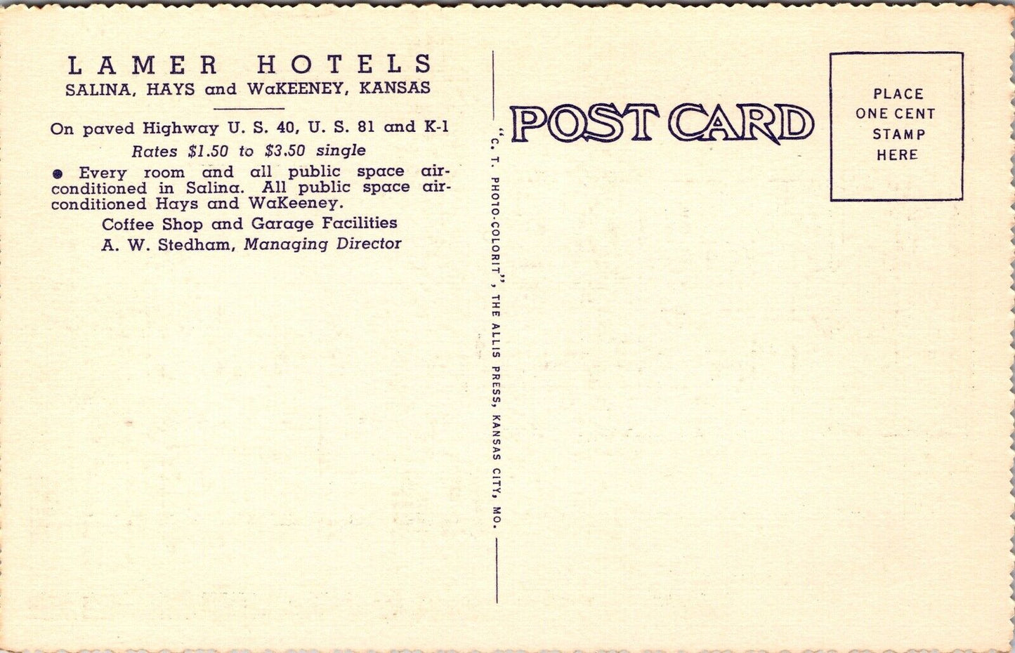 Linen Postcard Lamer Hotel US 40, US 81 and K-1 in Hays, Kansas
