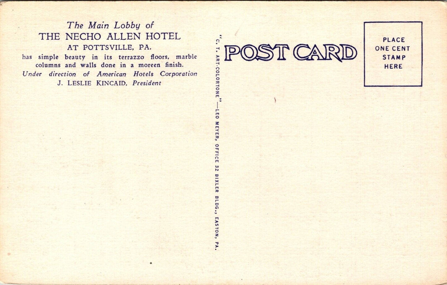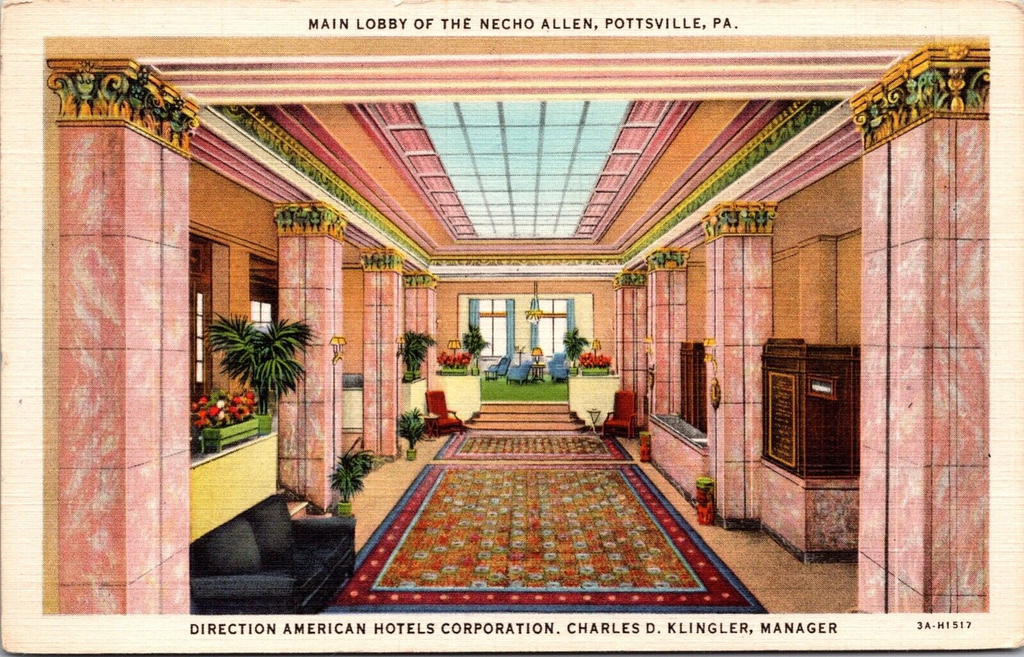Linen Postcard Main Lobby of the Necho Allen in Pottsville, Pennsylvania