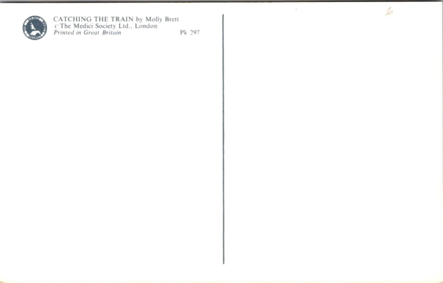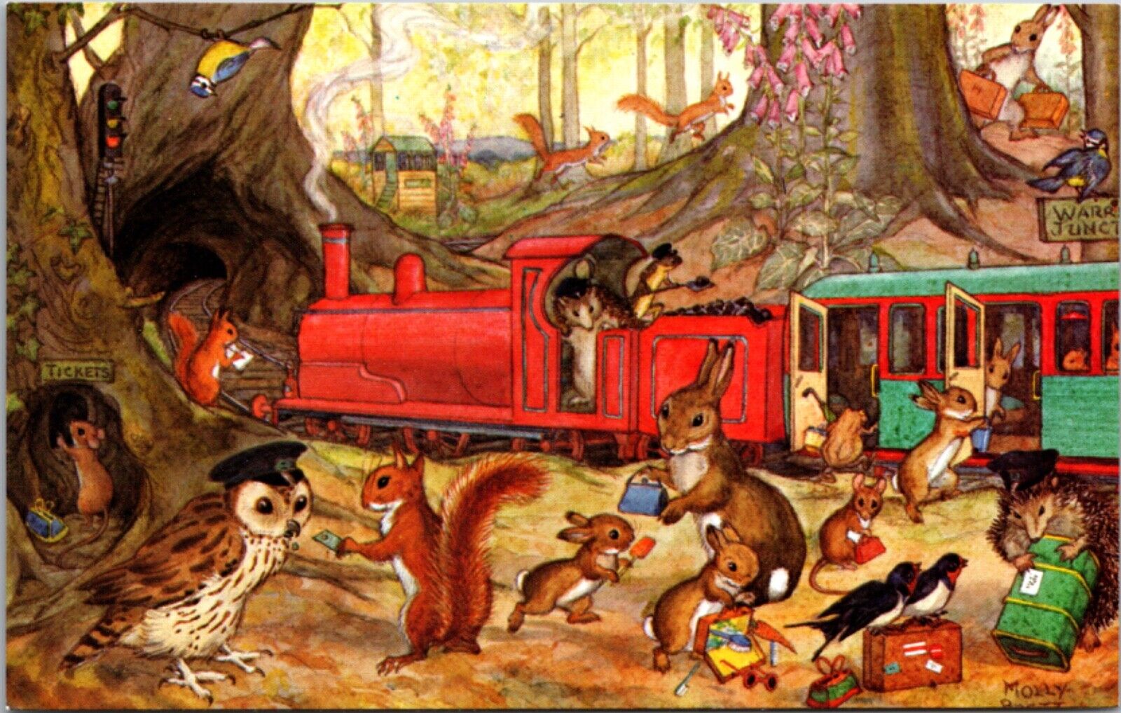 Molly Brett artwork Postcard Catching The Train Forest Animals Boarding Railroad