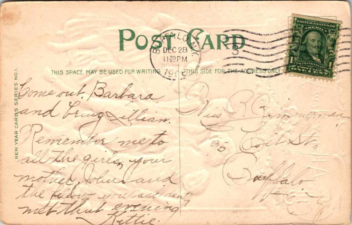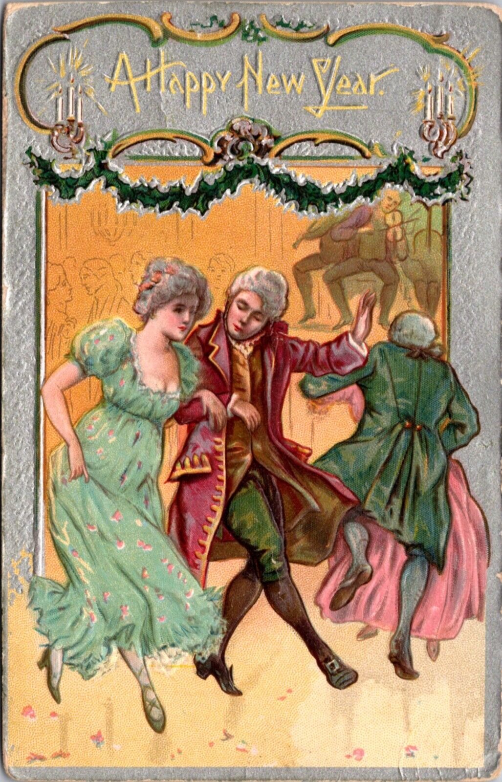 New Year Postcard Victorian Couples Dancing, Playing Music