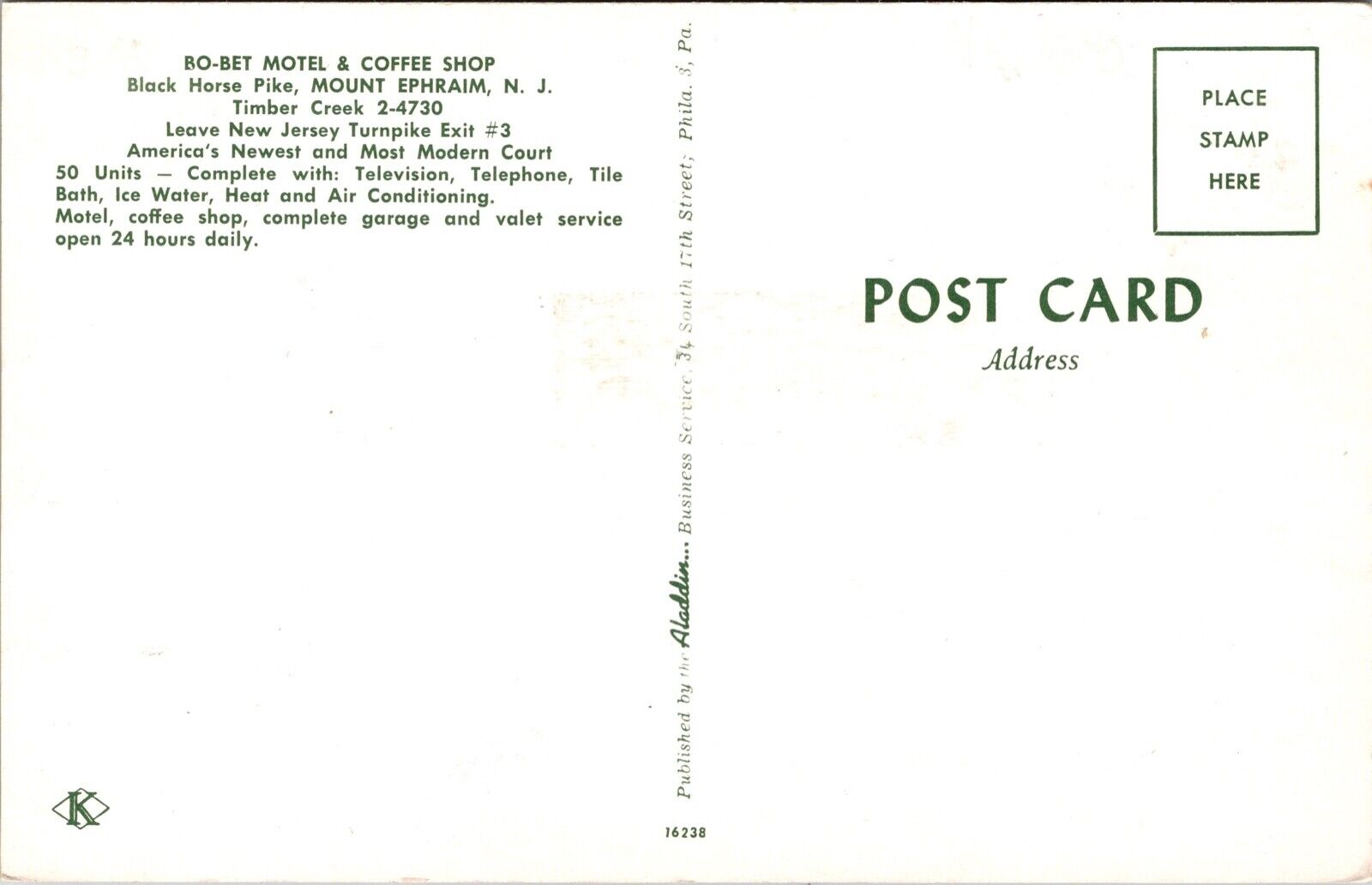 Postcard Bo-Bet Motel and Coffee Shop in Mount Ephraim, New Jersey