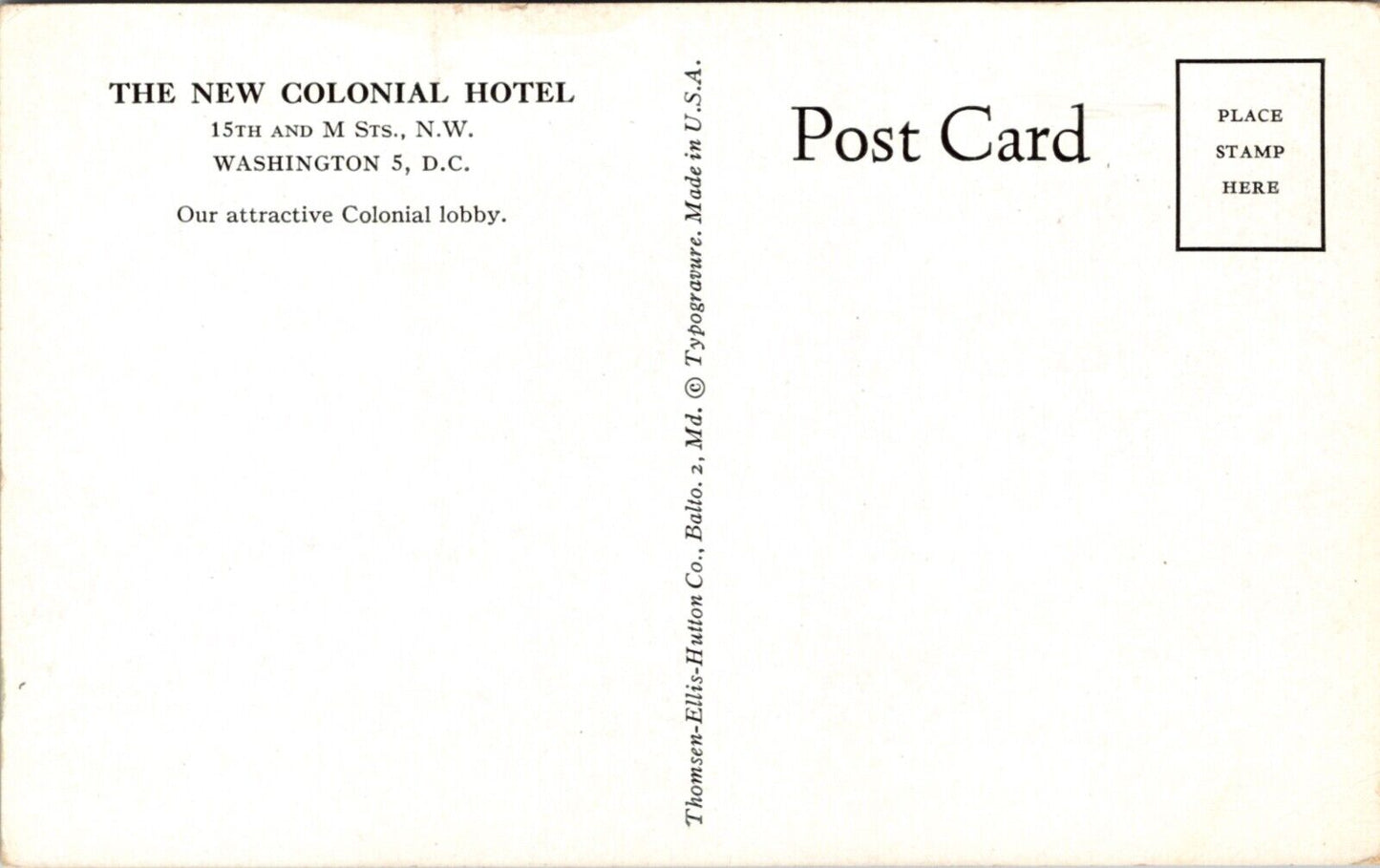 Postcard Lobby The New Colonial Hotel 15th and M Streets NW in Washington D.C.
