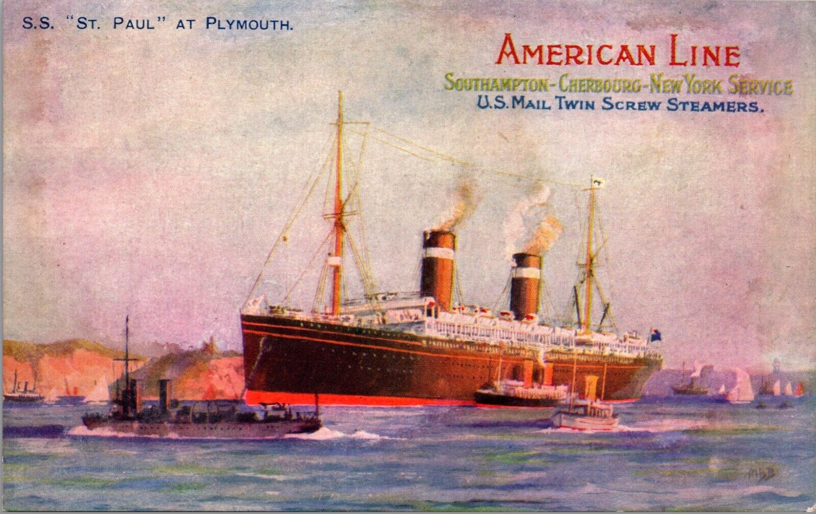 Postcard S.S. St. Paul at Plymouth American Line US Mail Twin Screw Steamers