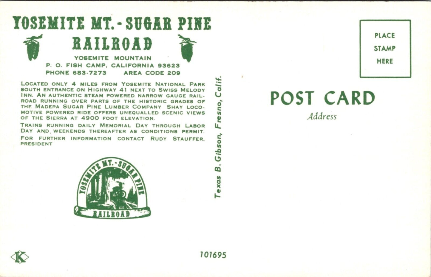 Postcard Yosemite Mt. Sugar Pine Railroad in Fish Camp, California