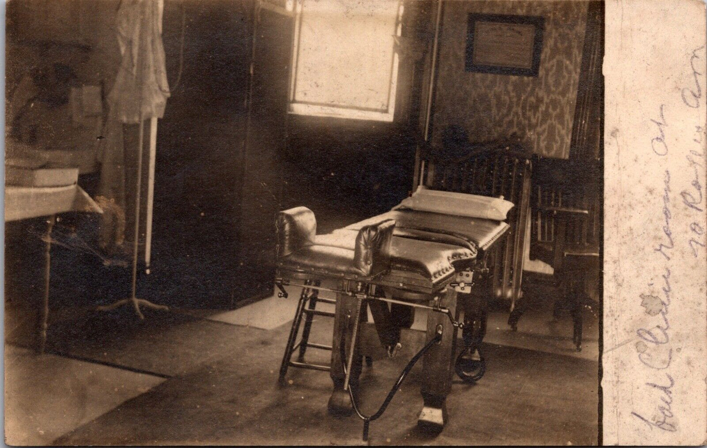Capture a moment in time with this authentic Real Photo Postcard, depicting a medical bed table from a doctor's office. A genuine slice of medical history, this standard-sized (5.5 x 3.5 in) paper postcard is an original, unposted piece from the Real Photo era (1900-Now), featuring an undivided back.