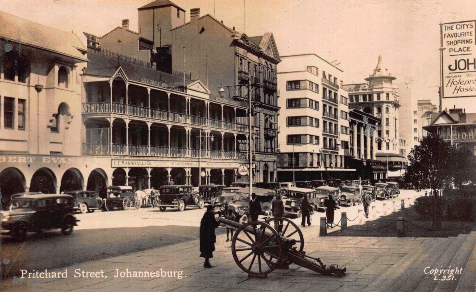 A vintage real photo postcard of Pritchard Street in Johannesburg, South Africa.