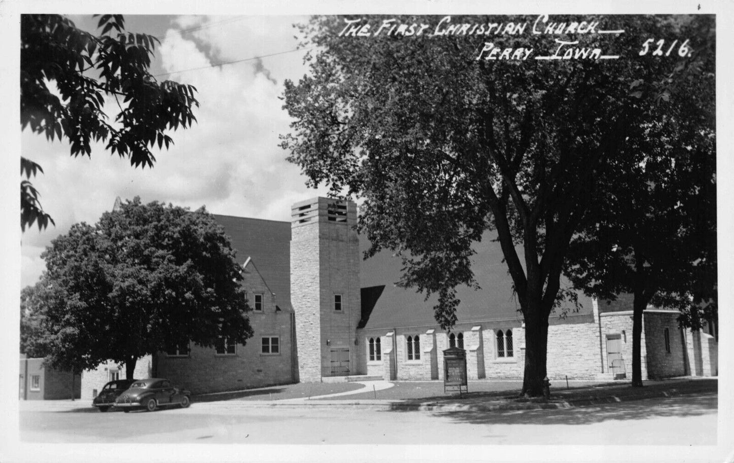 A vintage real photo postcard of First Christian Church in Perry, Iowa