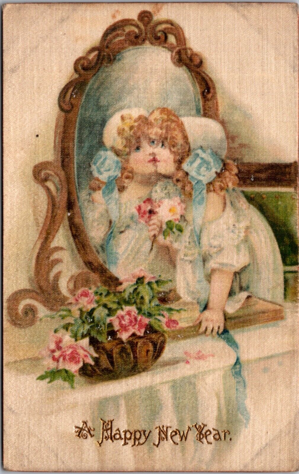 Silk A Happy New Year Postcard Little Girl Kissing Herself in a Mirror Pink Rose