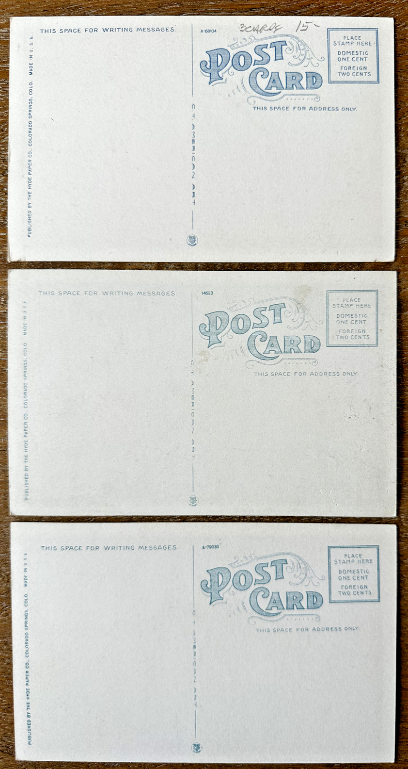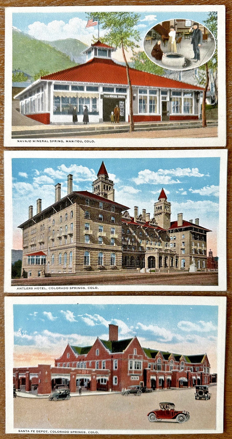 Three Postcards Railroad Depot, Hotel, Mineral Spring Colorado Springs, Colorado