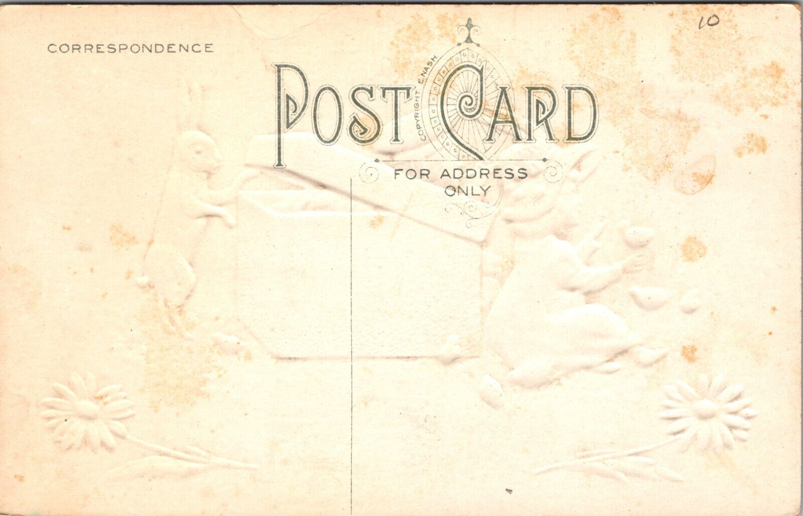 This vintage Easter postcard features a charming scene of a boy and girl with chicks and a white bunny opening a box. The postcard is standard sized (5.5 x 3.5 in) and made of paper. It is an original printed lithograph with embossed features and a divided back, perfect for collectors of holiday-themed postcards. The design includes elements like rabbits, animals, chicks, greetings, romance, and the Easter Bunny, making it a delightful choice for sending Easter wishes or adding to a collection of vintage postcards.