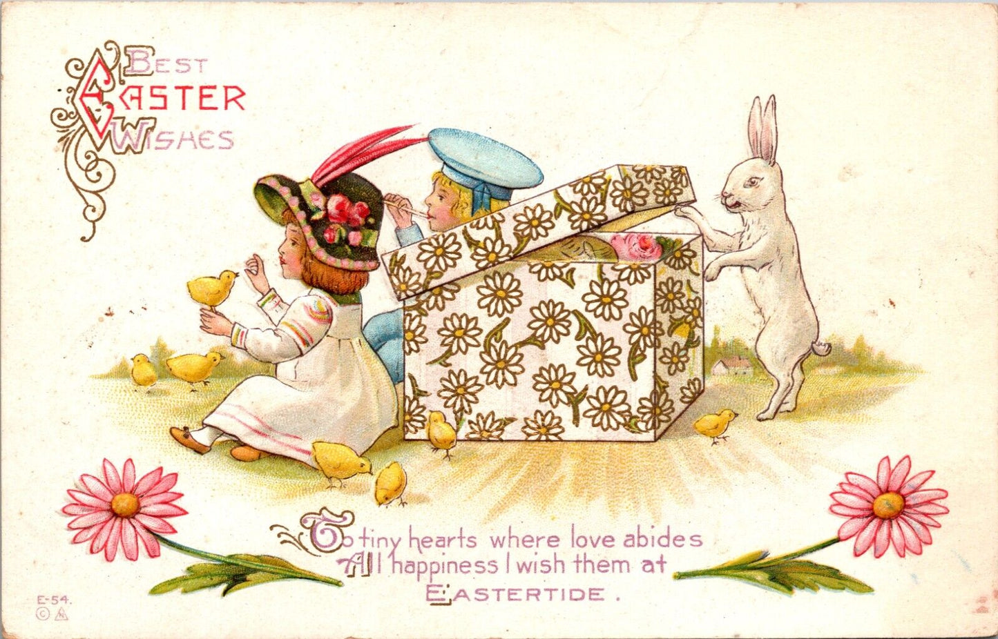 Vintage Easter Postcard Boy & Girl Chicks White Bunny Opens Box