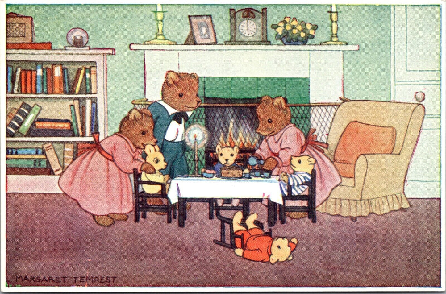 Vintage Postcard a/s M Tempest Teddy Bears Birthday Party Living Room Scene