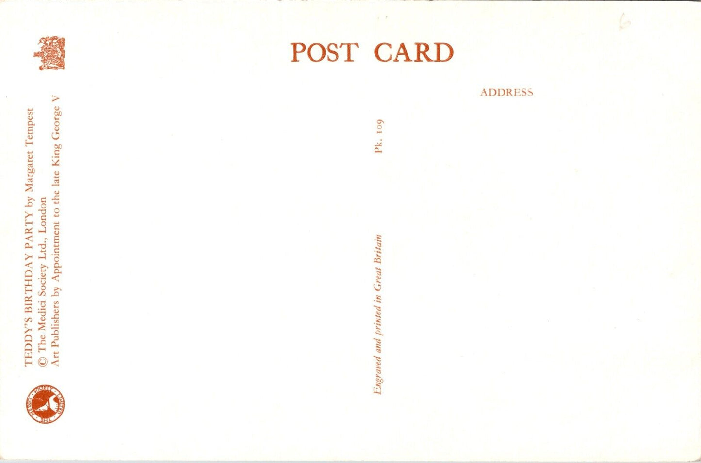 This vintage postcard features an original artwork by Margaret Tempest depicting a charming living room scene of teddy bears having a birthday party. The postcard is a single unit and is signed by the artist, adding to its collectible value. The divided back design indicates it is suitable for writing a message and sending as a greeting, making it a perfect choice for collectors of art, animals, and fantasy-themed postcards. Made by the Medici Society in the United Kingdom, this artist card showcases the whimsical and imaginative world of dressed-up bears in a delightful setting.