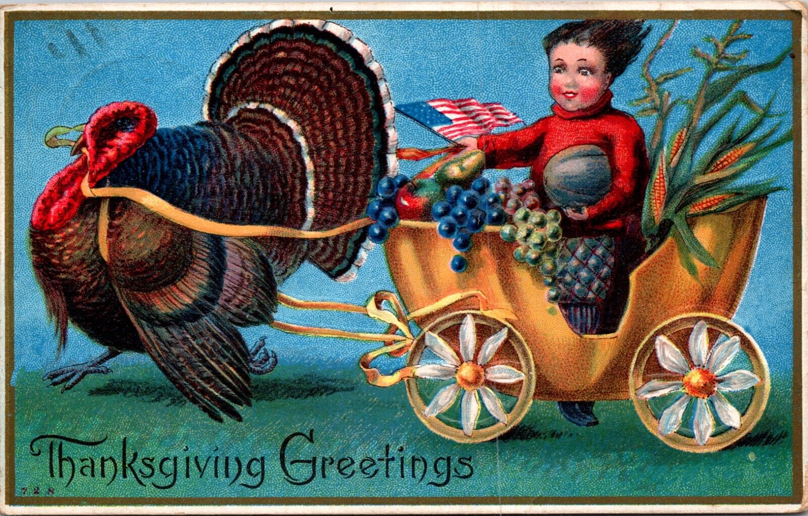Vintage Thanksgiving Postcard Boy with Flag in Pumpkin Carriage Drawn By Turkey