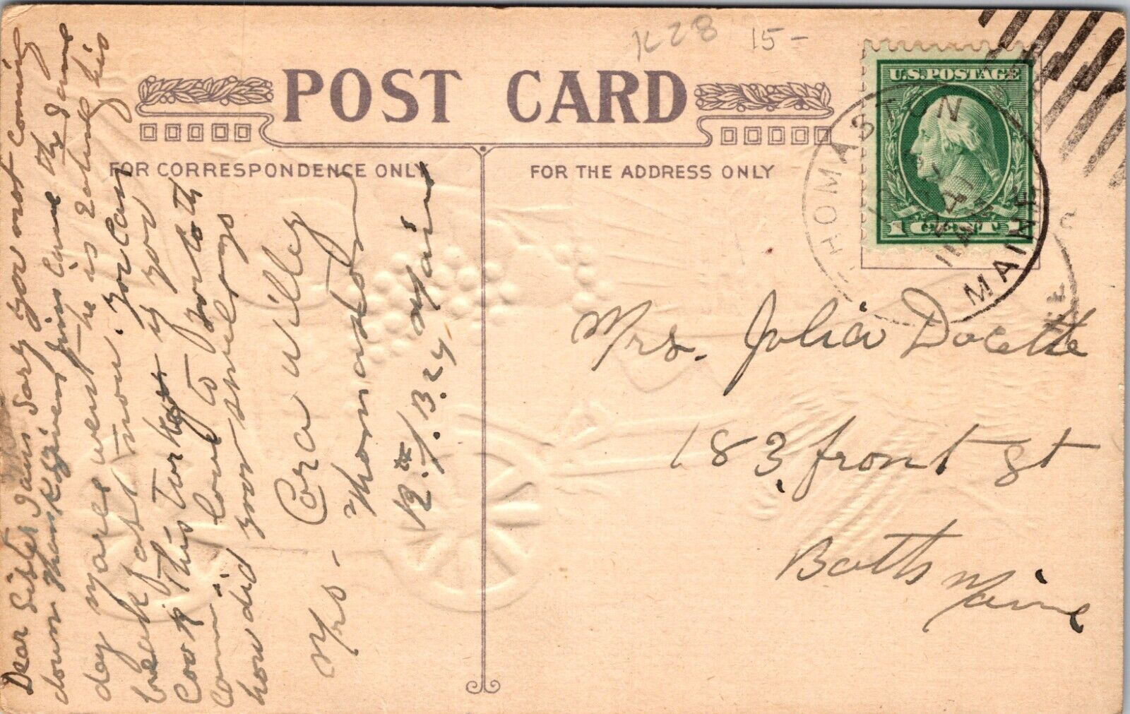 Capture the spirit of Thanksgiving with this charming vintage postcard featuring a delightful scene of a boy holding a flag & grapes in a pumpkin-shaped carriage, drawn by a turkey. The lithograph print, embossed for added dimension, is a wonderful celebration of the holiday's whimsy and the warmth of children's innocence.